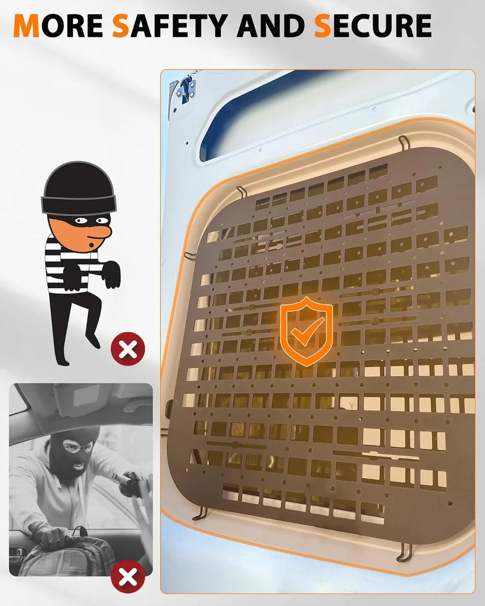 Enhanced Security: Crafted from heavy-duty steel, these window screens offer superior protection against forced entry. Designed to deter thieves and safeguard your valuables, the window screen with MOLLE system is an essential security upgrade for anyone using their van as a mobile workspace.