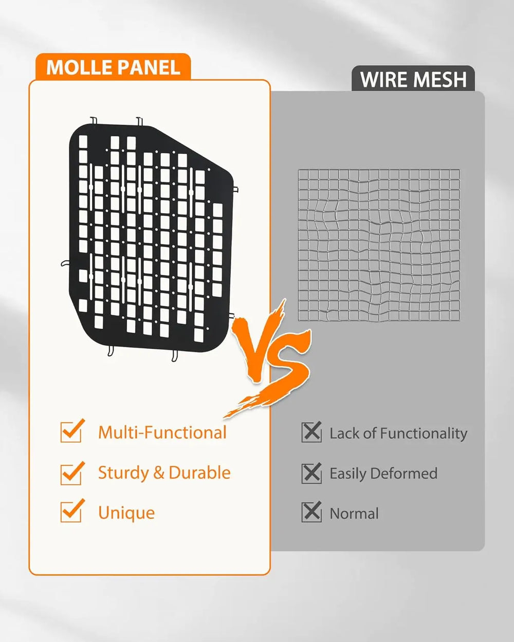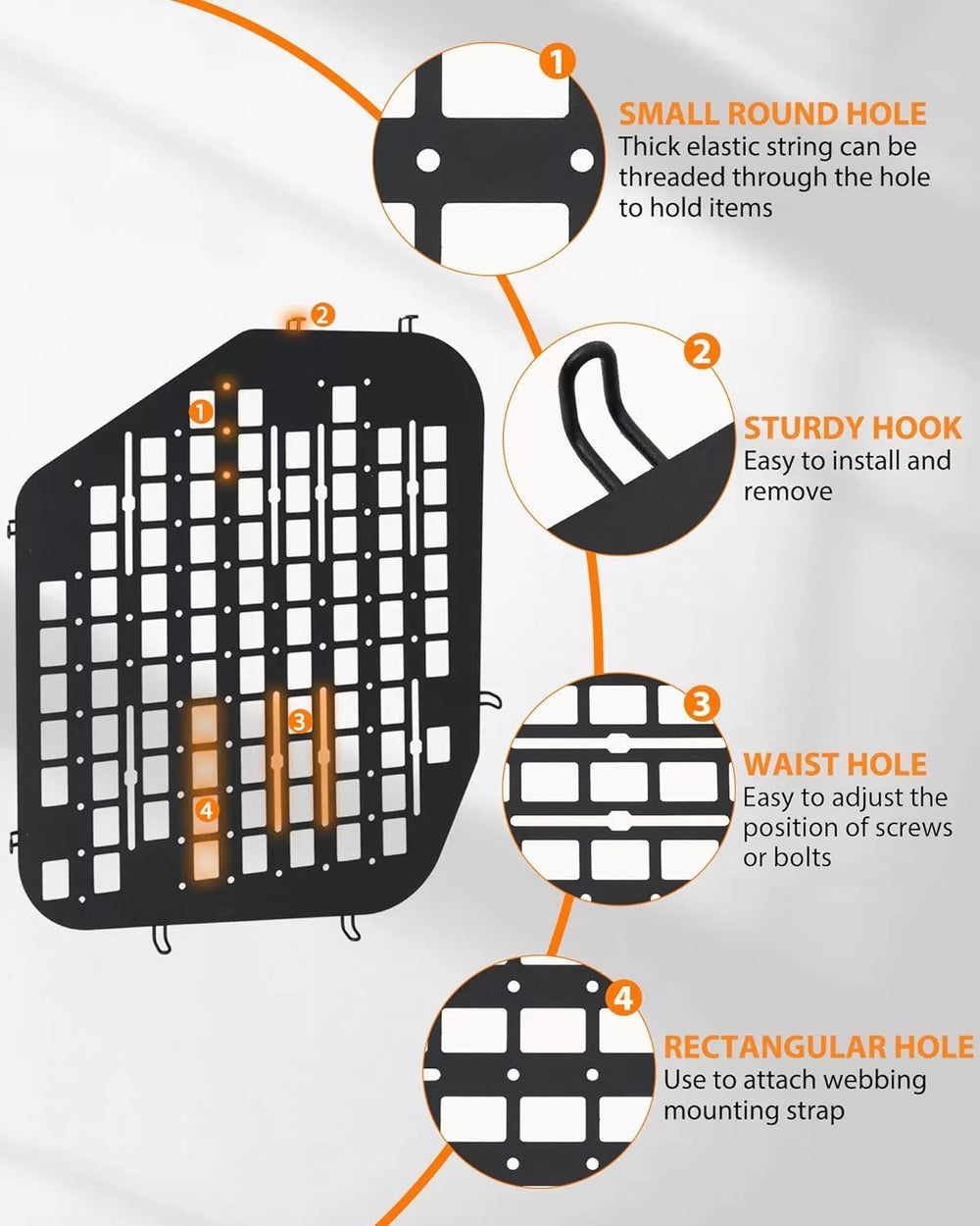 Versatile and Customizable: Thanks to the MOLLE system, you can personalize the security window screen to meet your specific needs. Whether you’re mounting a first-aid kit, fire extinguisher, or any other critical gear, the panel adapts to your lifestyle, providing tailored security and functionality.