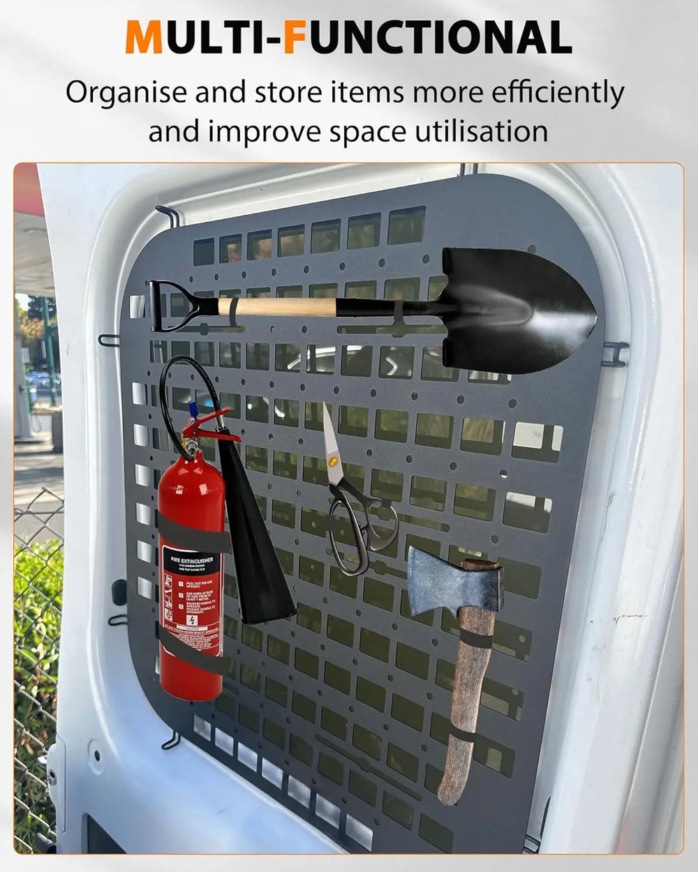 Enhanced Security: Constructed from heavy-duty steel, these window screens offer exceptional protection against forced entry. Designed to deter thieves and safeguard your valuables, the window screen with MOLLE system is essential for anyone who uses their van as a mobile workspace.