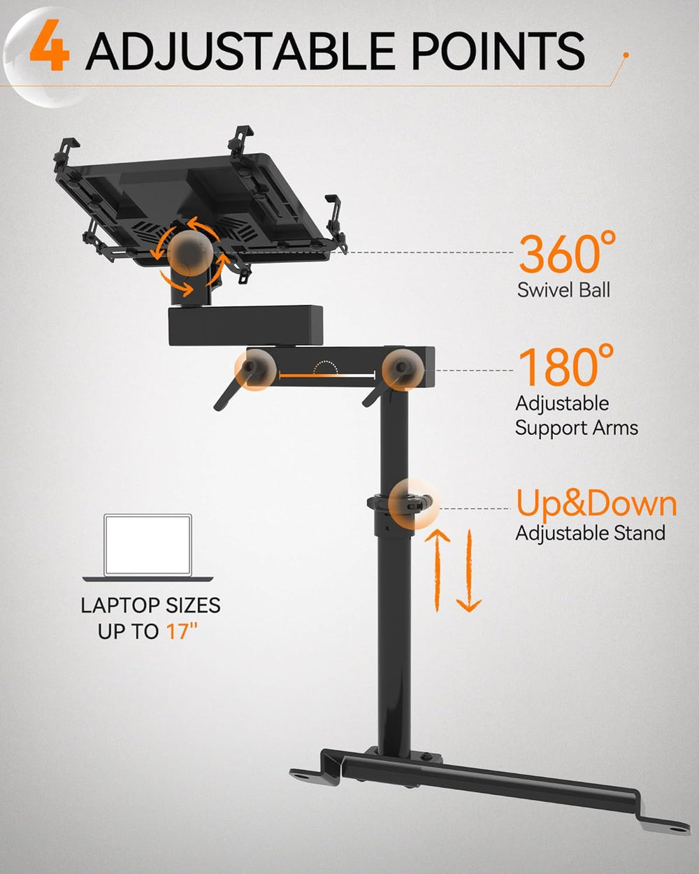 Multi Joint Design: Features three adjustable locking joints for optimal positioning, a telescopic pole for easy height adjustments, and five adjustable tray clamps that can securely hold laptops up to 17".
