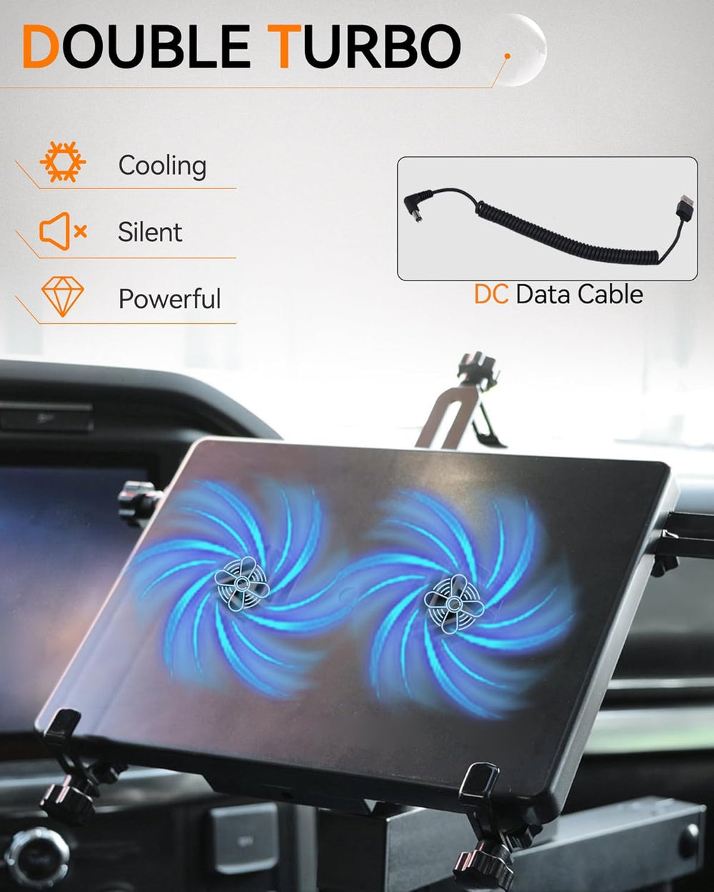 Double Turbo: Equipped with two USB-powered cooling fans, this vehicle laptop mount prevents overheating by increasing airflow, ensuring your laptop stays cool during use.