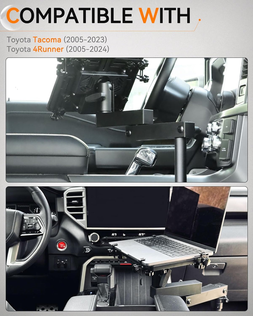 High Compatibility: The laptop stand fits 2005-2023 Toyota Tacoma and 2005-2024 Toyota 4Runner. No drilling required—simply install the base bracket onto the original co-pilot base track.