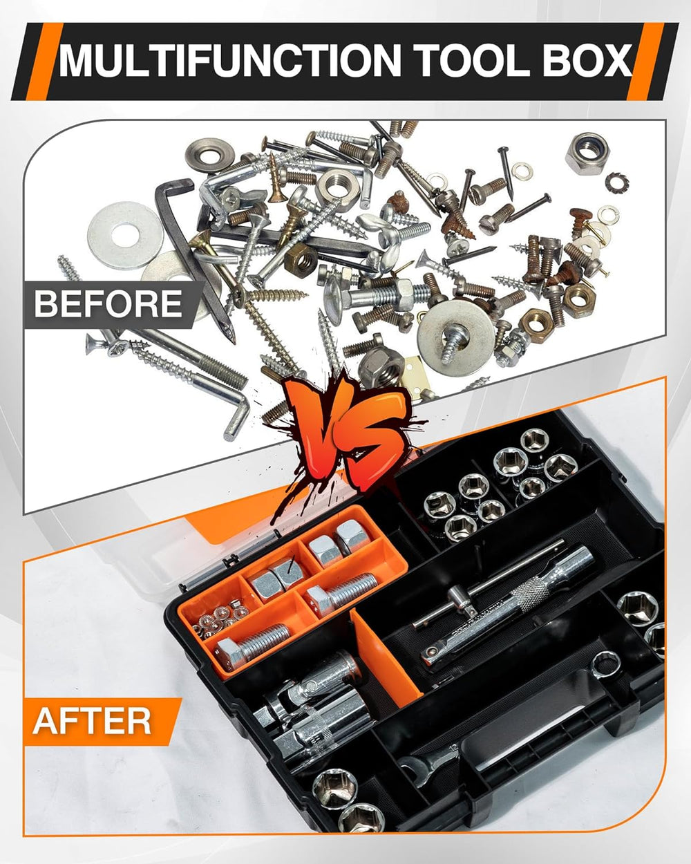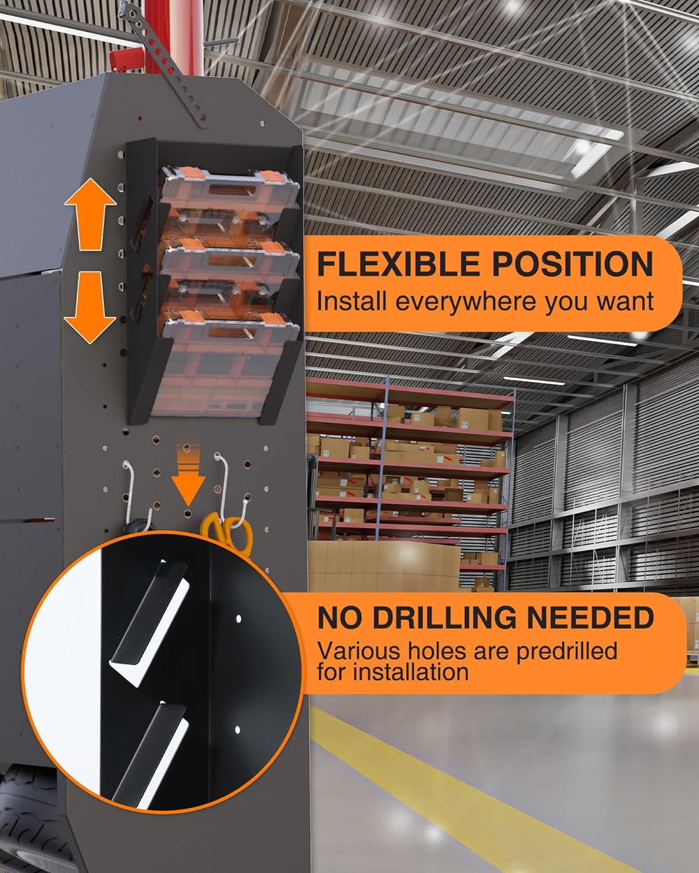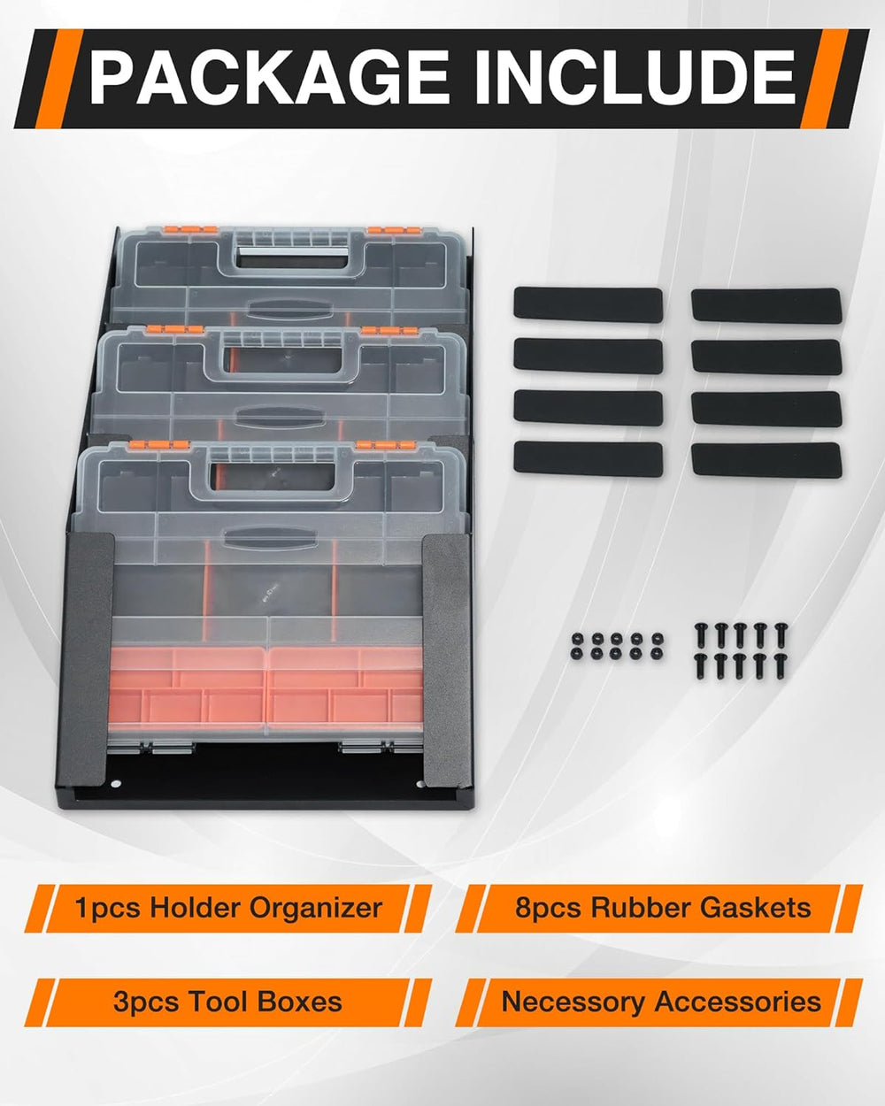 3pcs Storage Boxes: The holder organizer is equipped with 3 plastic tool boxes for storing various screws and nuts, keeping them organized. The boxes have removable compartments that you can adjust to keep small accessories as needed.