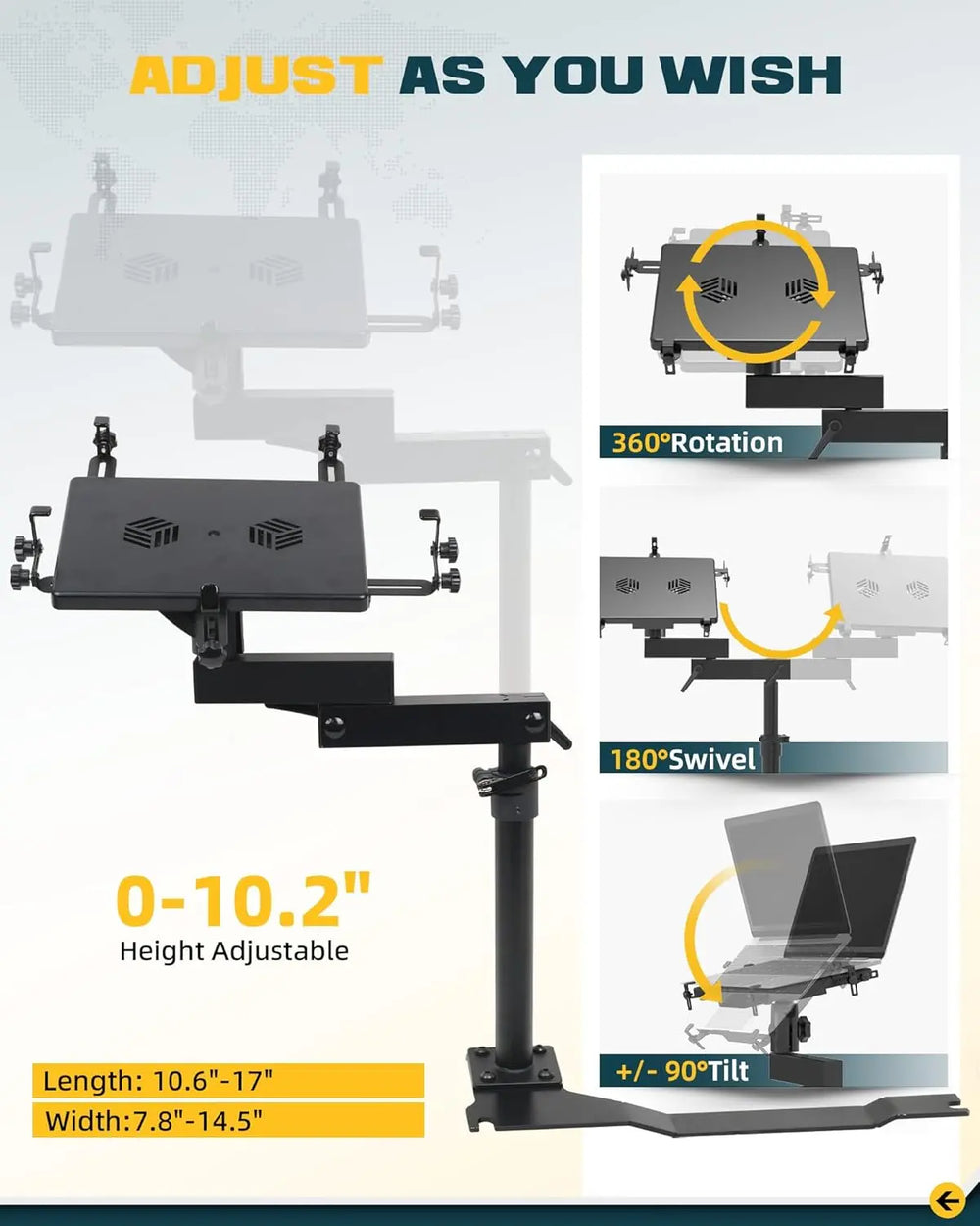 PERFECT COMPATIBILITY: Specifically designed for 2024-2025 Toyota Tacoma models, this laptop mount ensures effortless installation without any drilling. Simply mount the base bracket onto the existing passenger seat track for a secure setup.