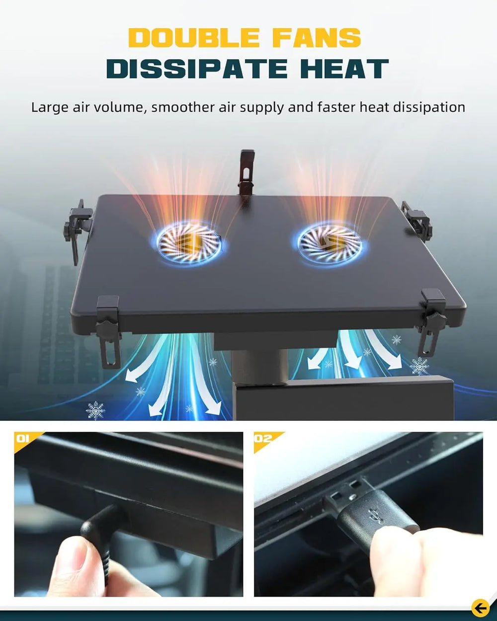 Explore the ultimate solution for your Tacoma 2024+ with our truck laptop mount featuring dual cooling fans and convenient USB ports. Keep your devices cool and charged while on the go!