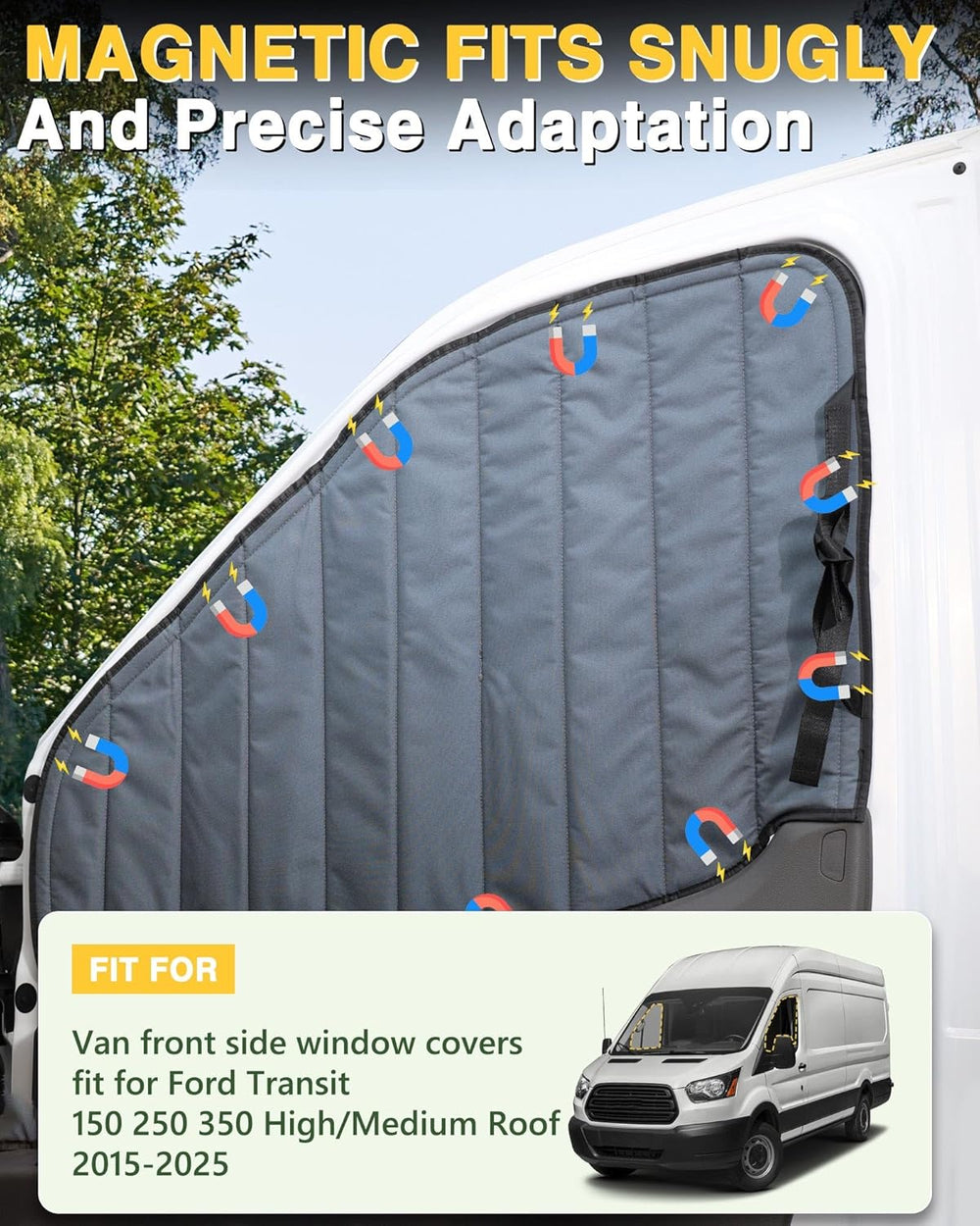 Fits Ford Transit 150/250/350 High & Medium Roof (2015–2025) | Magnetic Front Door Side Window Shades | Gray | Pair