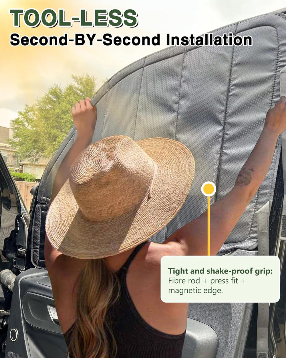Installs in seconds—no tools required. Strong rare-earth magnets and flexible fiberglass rods keep the shades securely in place, even while driving or during windy conditions.