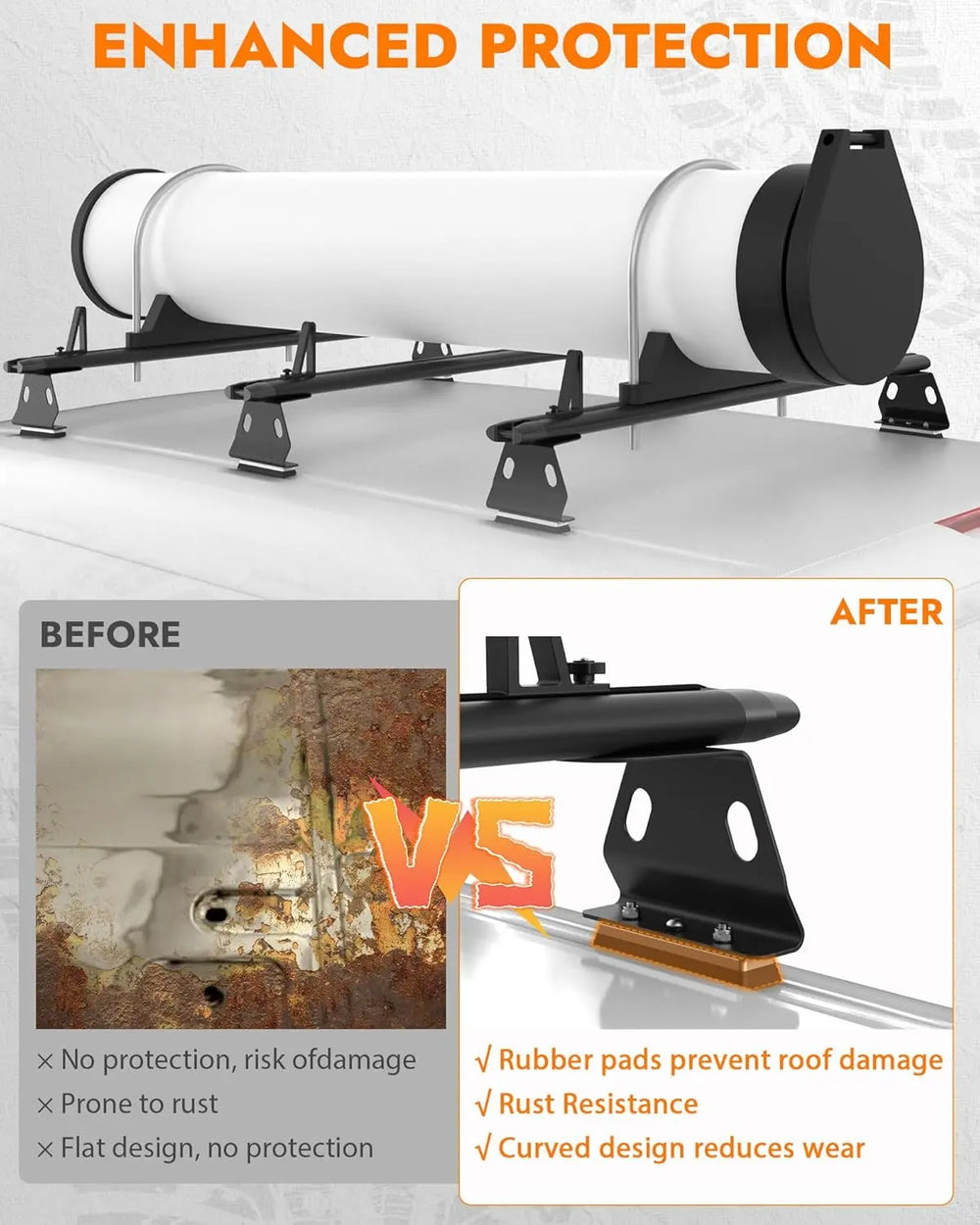 WIND NOISE REDUCE:This aluminum van roof rack features clean, streamlined lines that closely follow the vehicle roof for a professional, low-profile look. The aerodynamic C-shaped crossbars improve stability and reduce drag at highway speeds. Also we provide rubber sealing strips that can be inserted into the crossbars’ upper and lower channel to reduce wind-noise effectively.