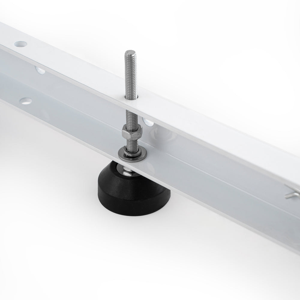 An extra-wide 8" base welded to the uprights provides a full seal with the roof. Rubber end caps and ladder stoppers reduce wind noise and vibration while keeping water out.