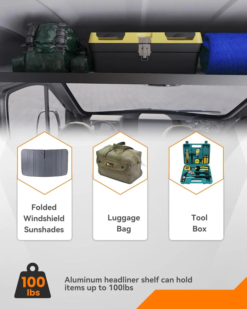 Maximize Space: Strong and durable, the black powder-coated headliner shelf can hold various items, such as a folded windshield sunshade, luggage bag, toolbox, and other personal belongings.