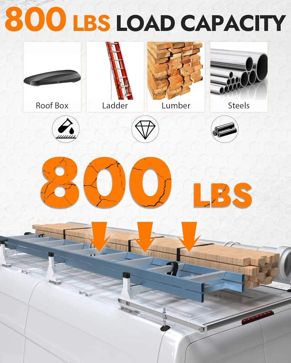 800 LBS Load Capacity: This cargo van roof rack is ideal for commercial use, with each bar supporting an evenly distributed load capacity of 250 pounds. It accommodates pipes, ladders, tubes, and other bulky items effortlessly.