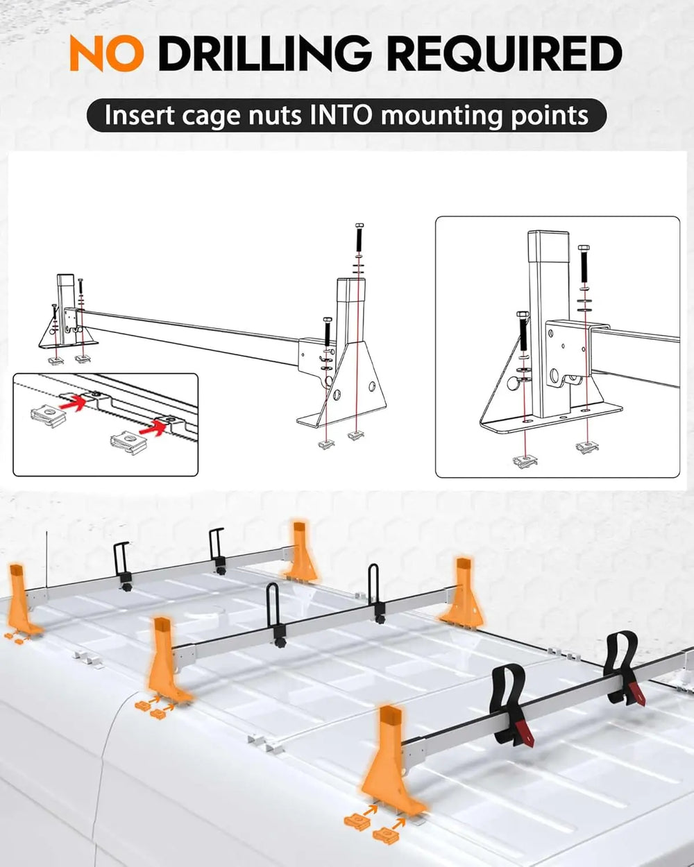 Unique Design: The van rack crossbars feature a non-slip plastic bar guard to prevent shifting of ladders and gear. Rubber caps effectively reduce wind noise and prevent water leakage.